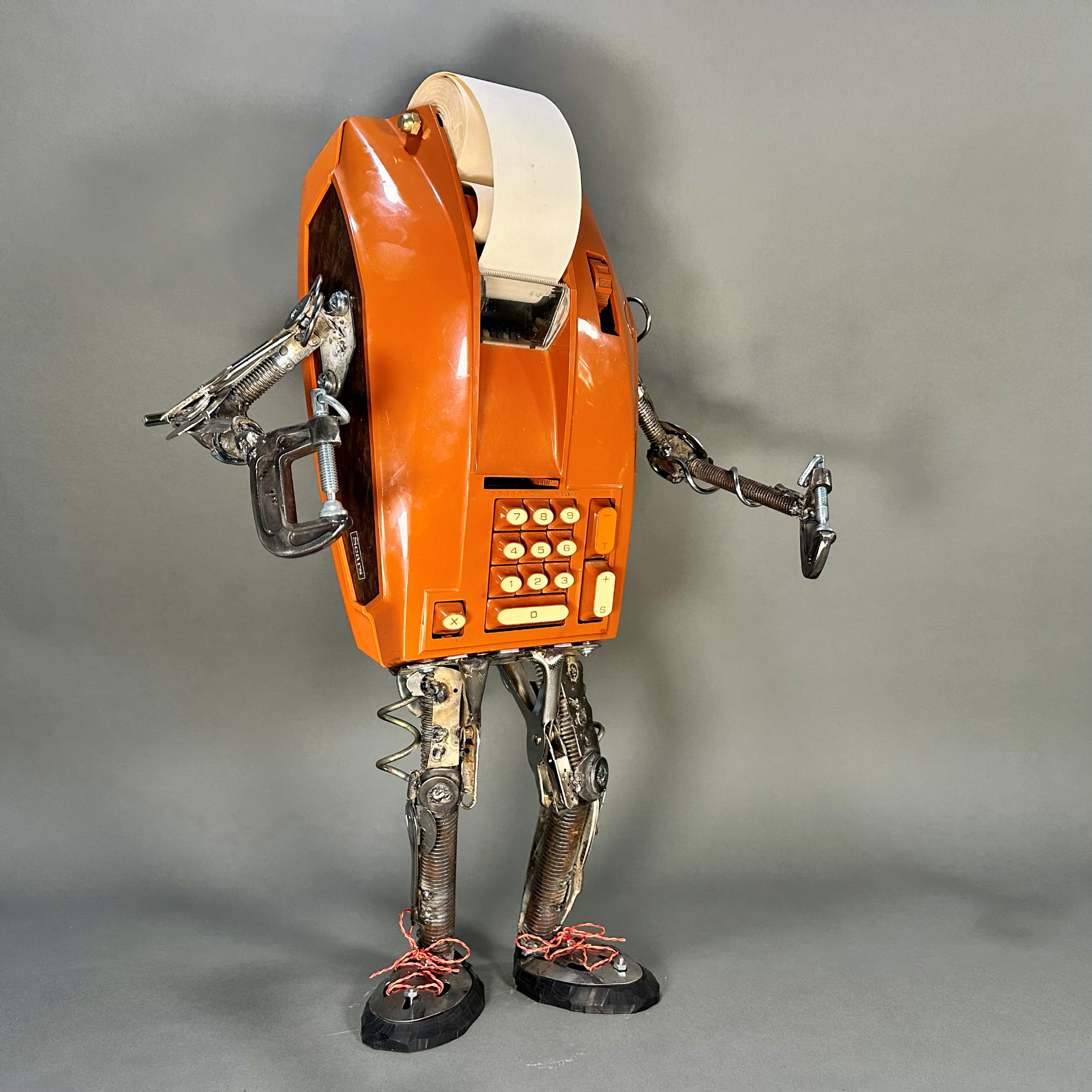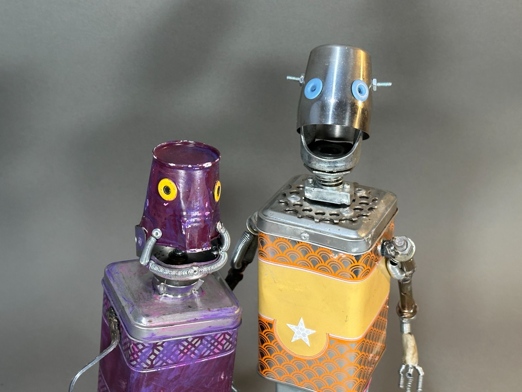 Found objects such as vintage cans, containers, tea and coffee pots, pipes, tubing, bicycle parts, and flatware are creatively combined to produce unique and eclectic works of art. The assemblage technique used highlights repurposing and recycling, giving new life to discarded items. The sculptures incorporate a blend of vintage and industrial elements, resulting in a nostalgic yet futuristic feel.